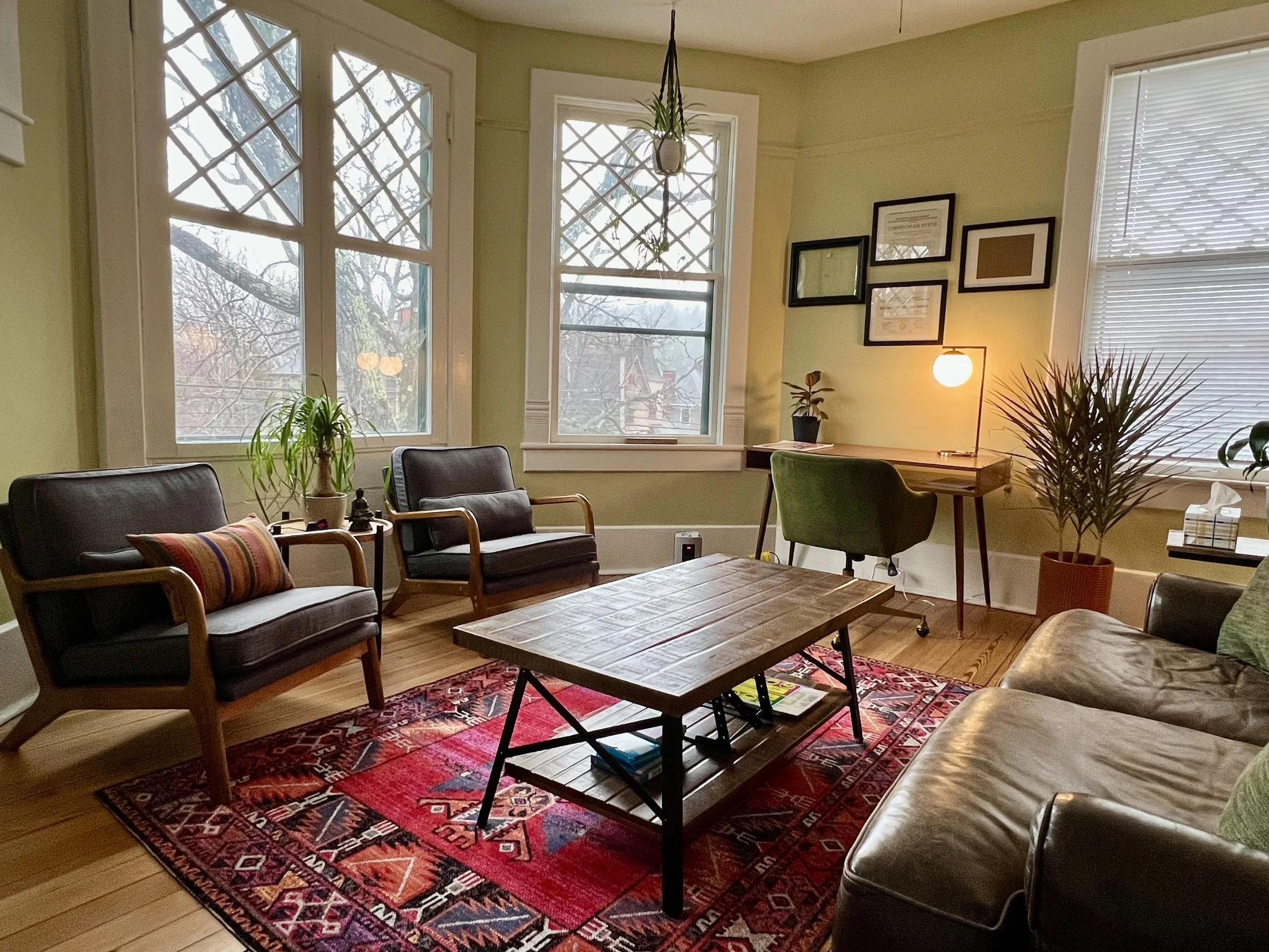 A warm and inviting office space in downtown Asheville, where in-person sessions are held.